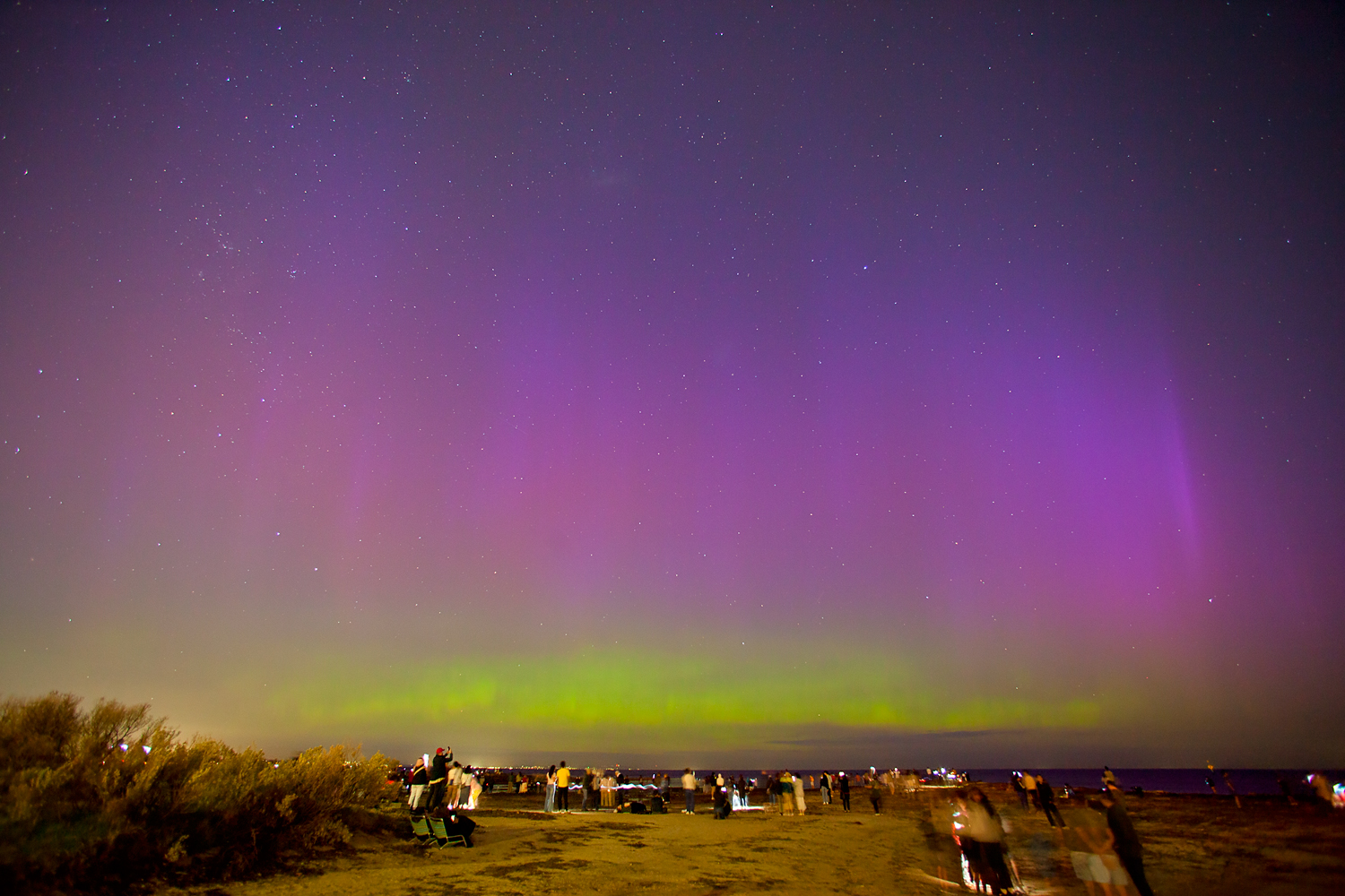Aurora Australis, Rickett's Point, 20th January 2026, 11:02pm AEDT; strong auroral arc, one strong beam visible to the naked eye and colours developing further in the S quadrant. Very foreshortened curtaining is also evident.