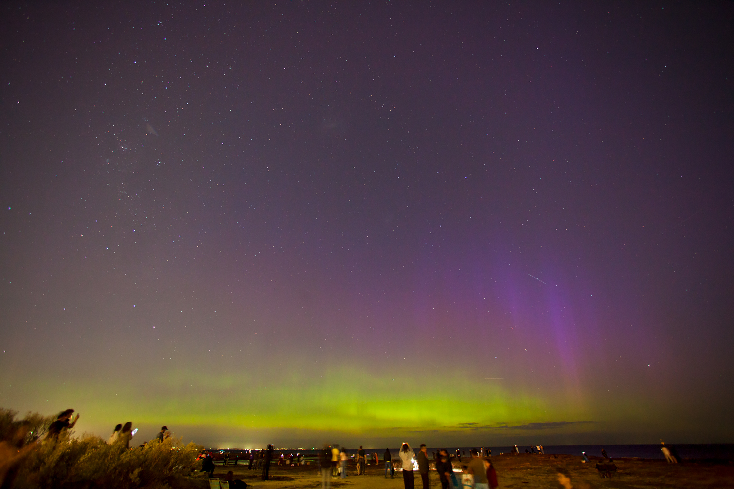 Aurora Australis, Rickett's Point, 20th January 2026, 11:14pm AEDT; strong auroral arc with foreshortened curtaining is evident, though other activity much reduced. One persistent beam to the left of Achernar.